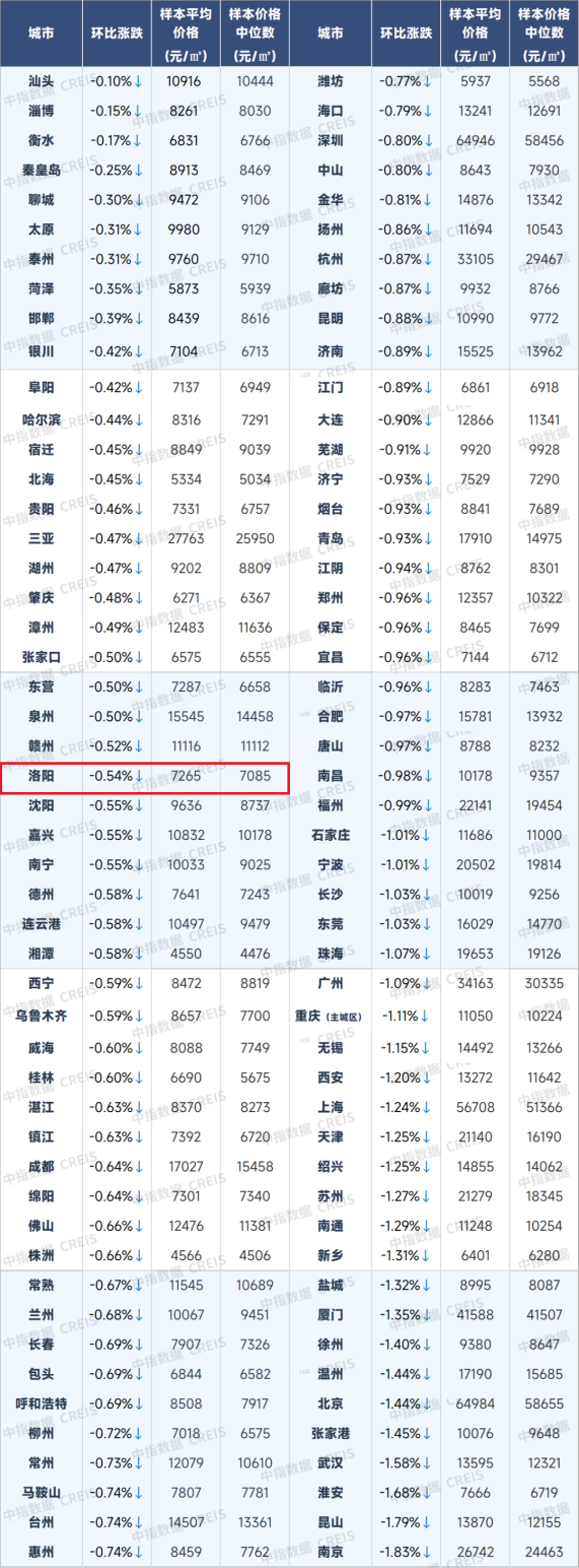 根据中国房地产指数系统百城价格指数对全国100个城市新建、二手住宅销售市场及50个城市租赁市场的调查数据:新房方面,11月百城新建住宅均价为17036元/平方米,环比上涨0.37%,同比上涨2.68%。11月百城二手住宅均价为13143元/平方米,环比下跌0.94%,跌幅较上月扩大0.1个百分点,同比下跌7.95%。11月洛阳新建住宅均价为7930元/平方米,环比下跌0.18%,二手住宅均价为7265元/平方米,环比下跌0.54%。