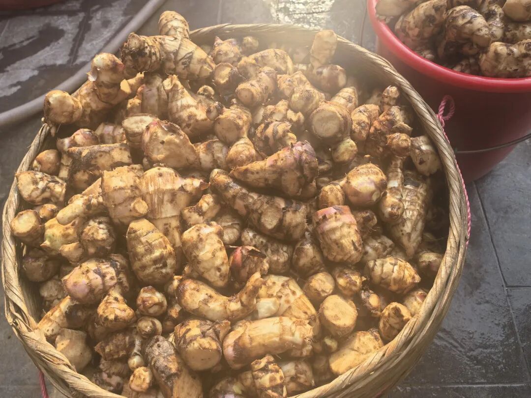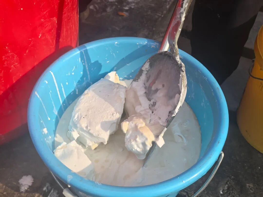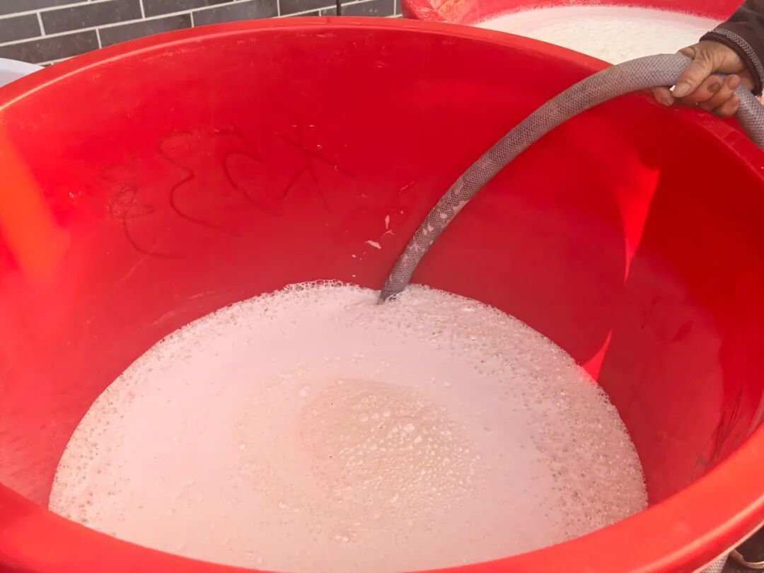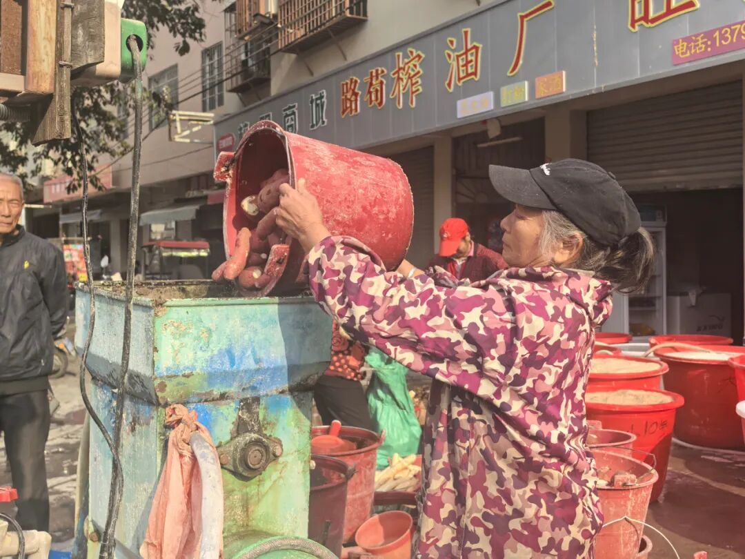 操作碾粉设备的阿姨动作麻利,抬手间便将一桶桶作物倒入研磨机,块茎瞬间被碾成碎渣,乳白色的浆液顺着设备流出,汇入一旁大桶,再加入清水搅拌均匀,静待后续沉淀。