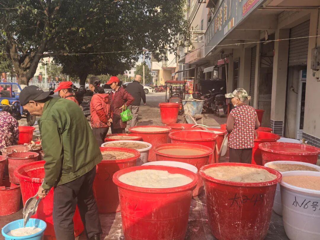 在我县顿岗镇一处碾粉坊内,机器运转声不绝于耳,坊外空地上,数十个红色大桶整齐排列,格外醒目。农户们或挑担前行,或驾车而来,将洗净的番薯、魔芋,以及去皮后的木薯一一送来,在门口有序排队,等候碾制淀粉,一派繁忙景象。