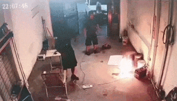 2021年8月,新疆塔城一汽车修理店,两男子在作业过程中,操作不慎导致油泵起火。其中一男子慌乱之下,想用嘴将火吹灭,幸好另一男子反应迅速,利用身边的灭火器成功将火扑灭。