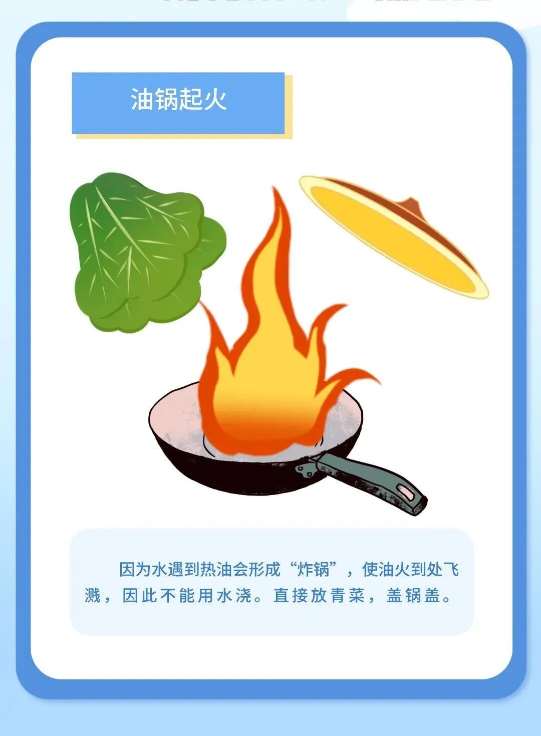 用水不但不能灭火,反而可能使火势扩大。油锅起火正确的处置方式是立刻关闭气源,用锅盖闷灭。